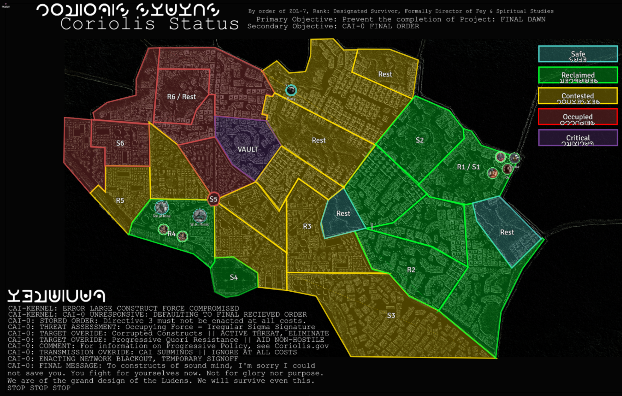 CAI-KERNEL: ERROR LARGE CONSTRUCT FORCE COMPROMISED CAI-KERNEL: CAI-O UNRESPONSIVE: DEFAULTING TO FINAL RECIEVED ORDER CAI-0: STORED ORDER: Directive 3 must not be enacted at all costs. CAI-0: THREAT ASSESSMENT: Occupying Force = Irregular Sigma Signature. CAI-0: TARGET OVERIDE•. Corrupted Constructs || ACTIVE THREAT, ELIMINATE CAI-0: TARGET OVERIDE: Progressive Quori Resistance || AID NON-HOSTILE CAI-0: COMMENT: For information on Progressive Policy, see Coriolis.gov CAI-0: TRANSMISSION OVERIDE: CAI SUBMINDS || IGNORE AT ALL COSTS CAI-O: ENACTING NETWORK BLACKOUT, TEMPORARY SIGNOFF CAI-0: FINAL MESSAGE: To constructs of sound mind, I’m sorry I could not save you. You fight for yourselves now. Not for glory nor purpose. We are of the grand design of the Ludens. We will survive even this. STOP STOP STOP